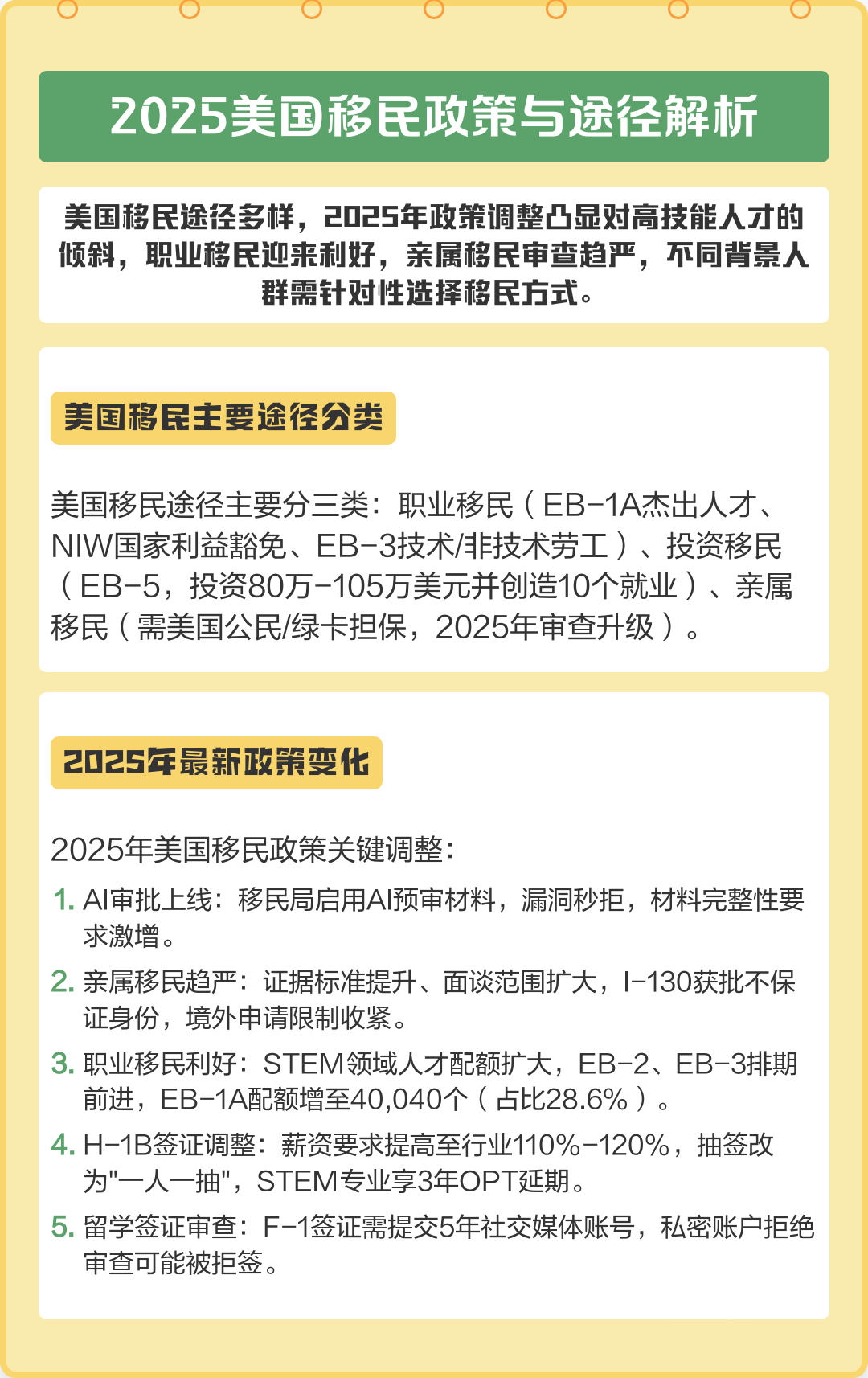 美国移民政策2025年调整:高技能人才利好,亲属移民趋严2025年美国移民政策向高技能人才倾斜,EB1A配额增至4万,NIW审批加速,H1B按薪资分级抽签;但亲属移民审查趋严,AI预审系统上线,材料要求更细(如省级奖项需搭配国家级曝光)。三大移民赛道解析:职业/投资/亲属选择要点1. 职业移民:EB1A适合有专利、行业峰会演讲、高薪offer的“隐藏大佬”;...